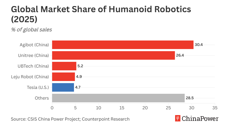 China dominates not just manufacturing of robots that walk and work (see below) but they also control 60% of the supply chain.